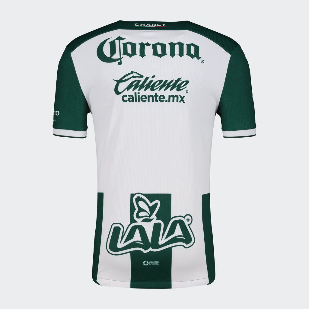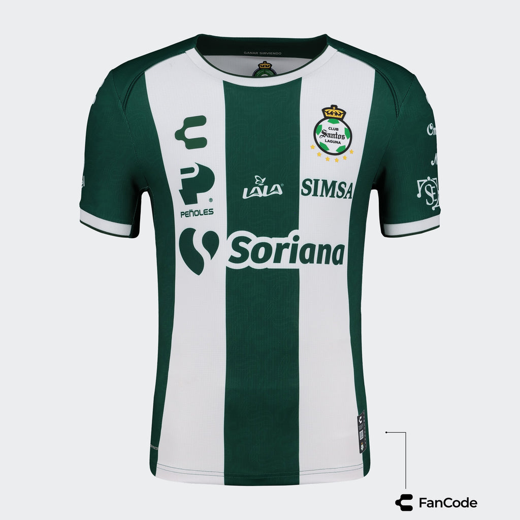 Vive la pasión del Club Santos Laguna con la camiseta de local Charly Santos temporada 24/25 . En homenaje al 25 aniversario del equipo, las dinámicas rayas verdes y blancas representan su sello distintivo. Diseñada para el máximo rendimiento, esta camiseta ofrece un ajuste perfecto y libertad de movimiento, con un estilo clásico y detalles elásticos únicos. Confeccionada en poliéster suave al tacto, la camiseta también luce la emblemática "S" y el escudo tradicional del equipo, con tecnología avanzada para mantenerte seco, fresco y libre de olores.