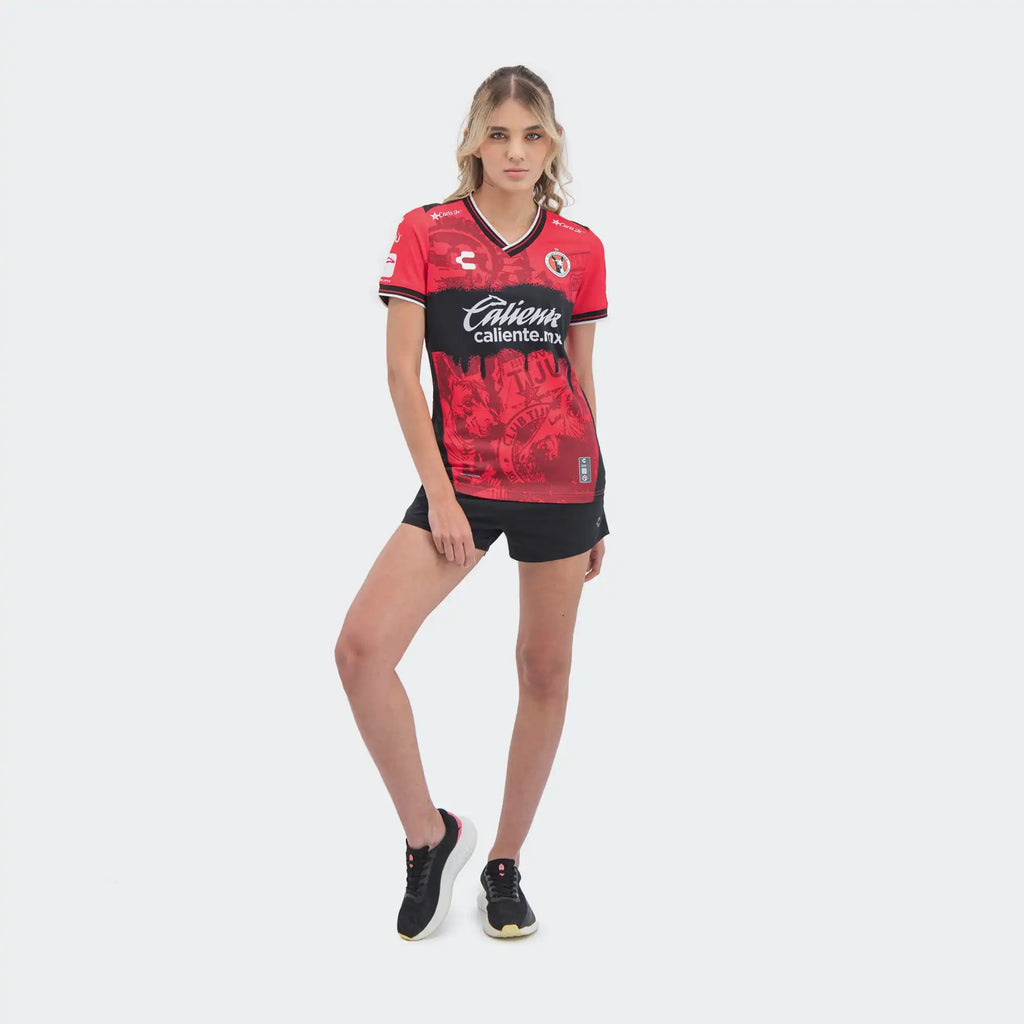 Demuestra tu orgullo por Tijuana con la camiseta de local de los Xolos de Tijuana 25/26 Charly Club (para mujer) . Con un llamativo diseño rojo con franjas negras estilo grafiti y símbolos locales icónicos, esta camiseta fusiona cultura y deporte. Sus paneles de malla transpirable y la tela DRY FACTOR, que absorbe la humedad, te mantienen cómoda y seca, mientras que la protección UV Block te ofrece protección solar. El corte clásico, el cuello en V cruzado y el escudo tradicional combinan estilo y comodidad para entrenar o jugar. Celebra el espíritu de La Jauría de la Liga MX en cada partido.