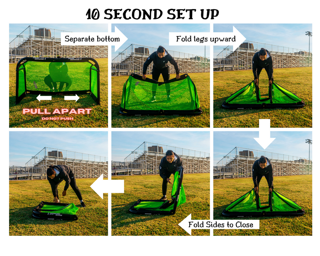 La portería de fútbol plegable QuickFold de Soccer Innovations cuenta con una estructura de aluminio que la hace ligera y extremadamente duradera. Está diseñada para usarse en todo tipo de superficies, como césped natural, césped artificial y cualquier superficie intermedia. Su peso la mantiene firme, a diferencia de las porterías plegables semicirculares que se popularizaron hace décadas, y sigue siendo igual de fácil de montar y desmontar. La portería QuickFold es la versión más resistente y duradera hasta la fecha. Con bisagras y componentes de aluminio robustos, incluyendo una barra trasera de aluminio, esta portería está construida para durar.