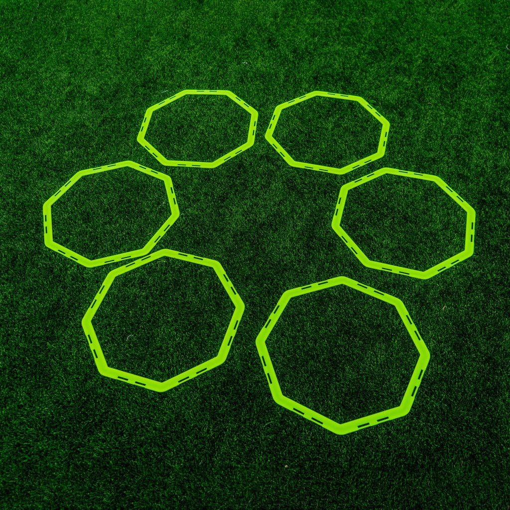 Transforma tu juego de pies, equilibrio, fuerza y flexibilidad con los Aros Octogonales de Agilidad de Soccer Innovations . Estos aros proporcionan una experiencia de entrenamiento dinámica, desafiando tus músculos para generar fuerza rápidamente y mejorar la aceleración, la desaceleración y la velocidad general. Fabricados con plástico verde fluorescente de alta densidad, cada aro se puede unir o separar fácilmente para un entrenamiento personalizado. Eleva tu entrenamiento de agilidad, velocidad y agilidad (SAQ) y alcanza nuevas metas con los Aros Octogonales de Agilidad de Soccer Innovations.