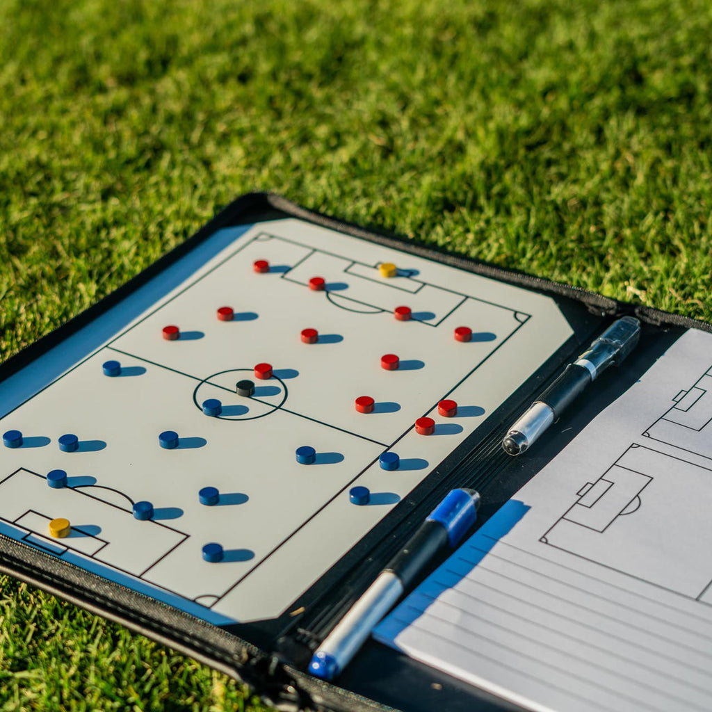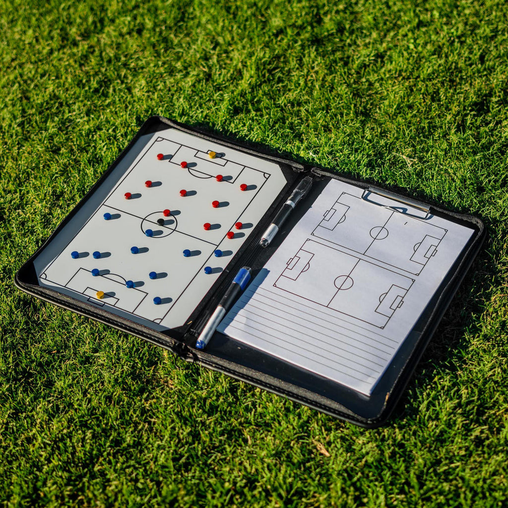 Esta carpeta Premier Soccer Coaches de Soccer Innovations facilita la ilustración de jugadas a balón parado y la creación de formaciones. Un lado incluye una pizarra magnética de borrado en seco con diagramas de fútbol, mientras que el otro cuenta con un portapapeles con bloc de notas y tres diagramas impresos del campo de fútbol. Su material de piel sintética negra mate, resistente a la intemperie, garantiza una inversión duradera para los entrenadores de fútbol apasionados.