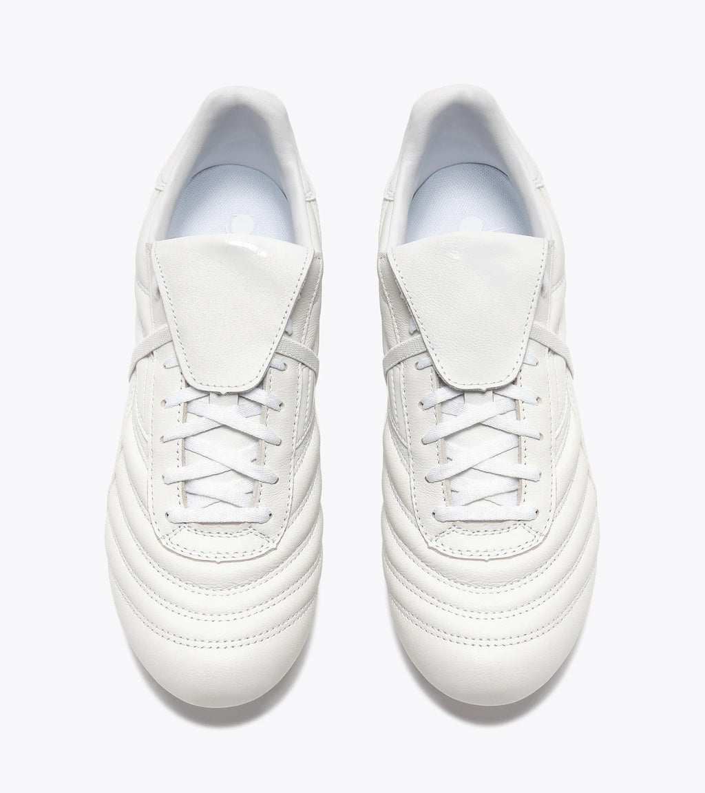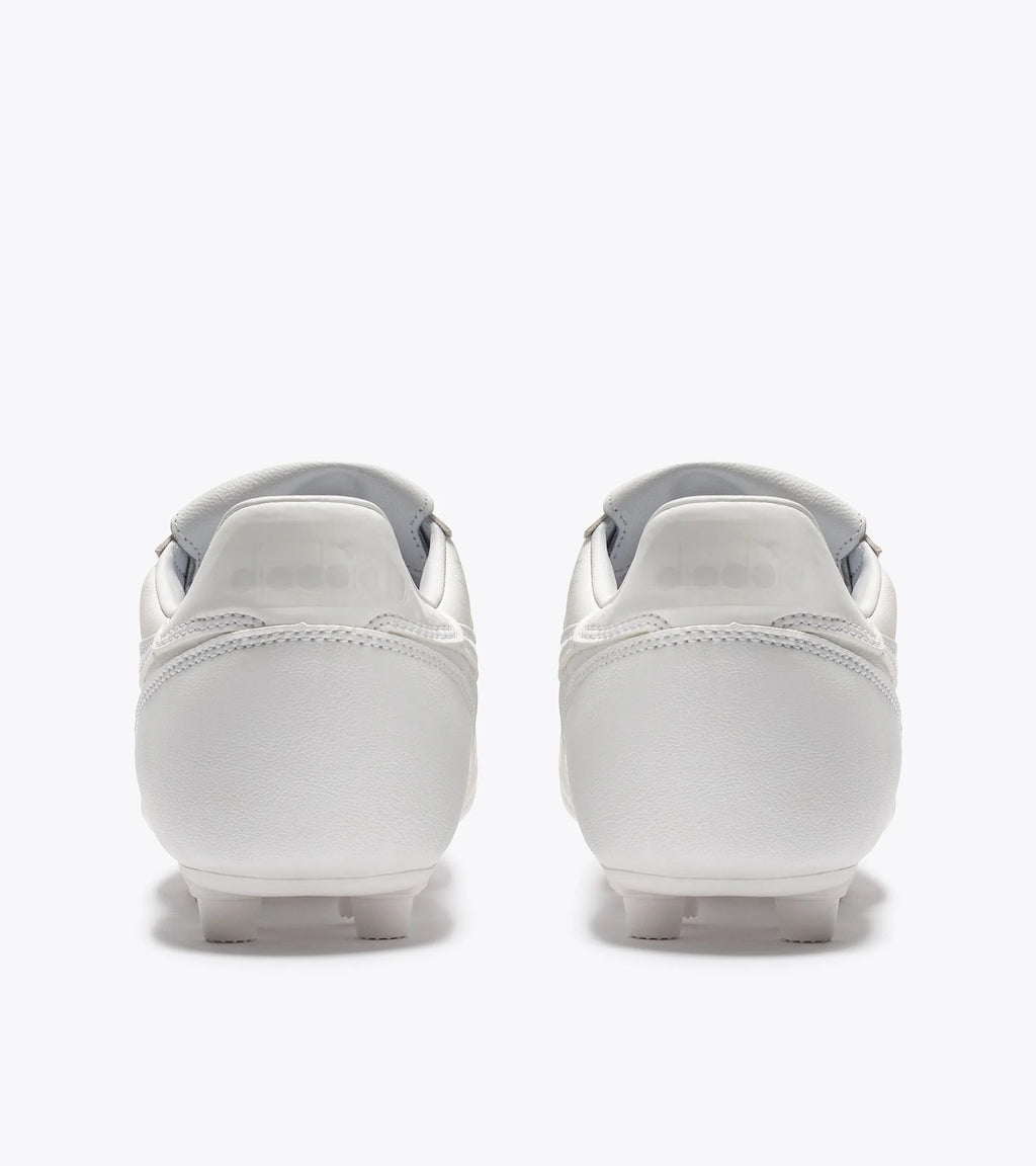 Botas de fútbol Diadora Brasil Icon LT T MDPU (blanco/blanco) es un Bota de fútbol de piel de grano completo ultrasuave, diseñada para quienes valoran la tradición sin renunciar al rendimiento. parte superior resistente al agua Se combina con un forro de tejido antiestiramiento, que proporciona fiabilidad y comodidad durante todo el día desde el primer uso. Suela de poliuretano con dureza diferenciada y 12 tacos fijos. Ideal para terrenos firmes.
