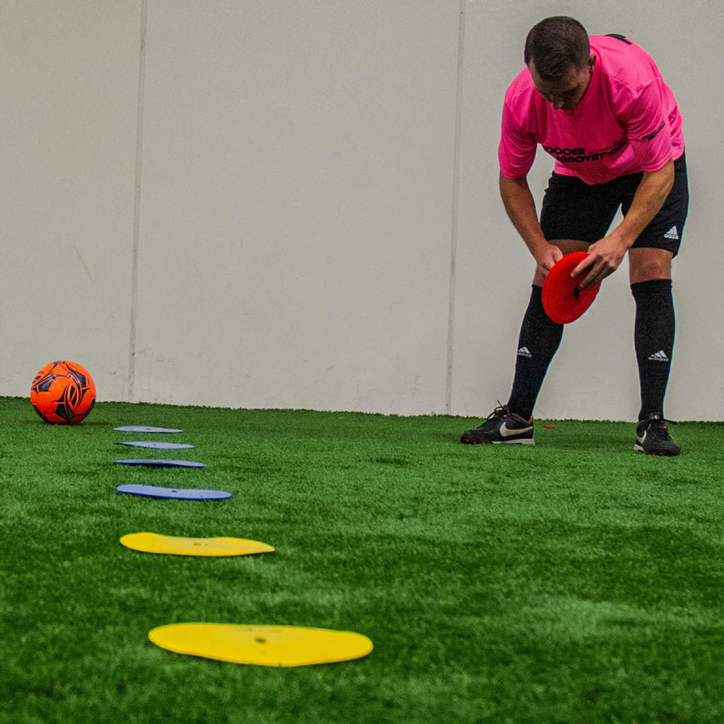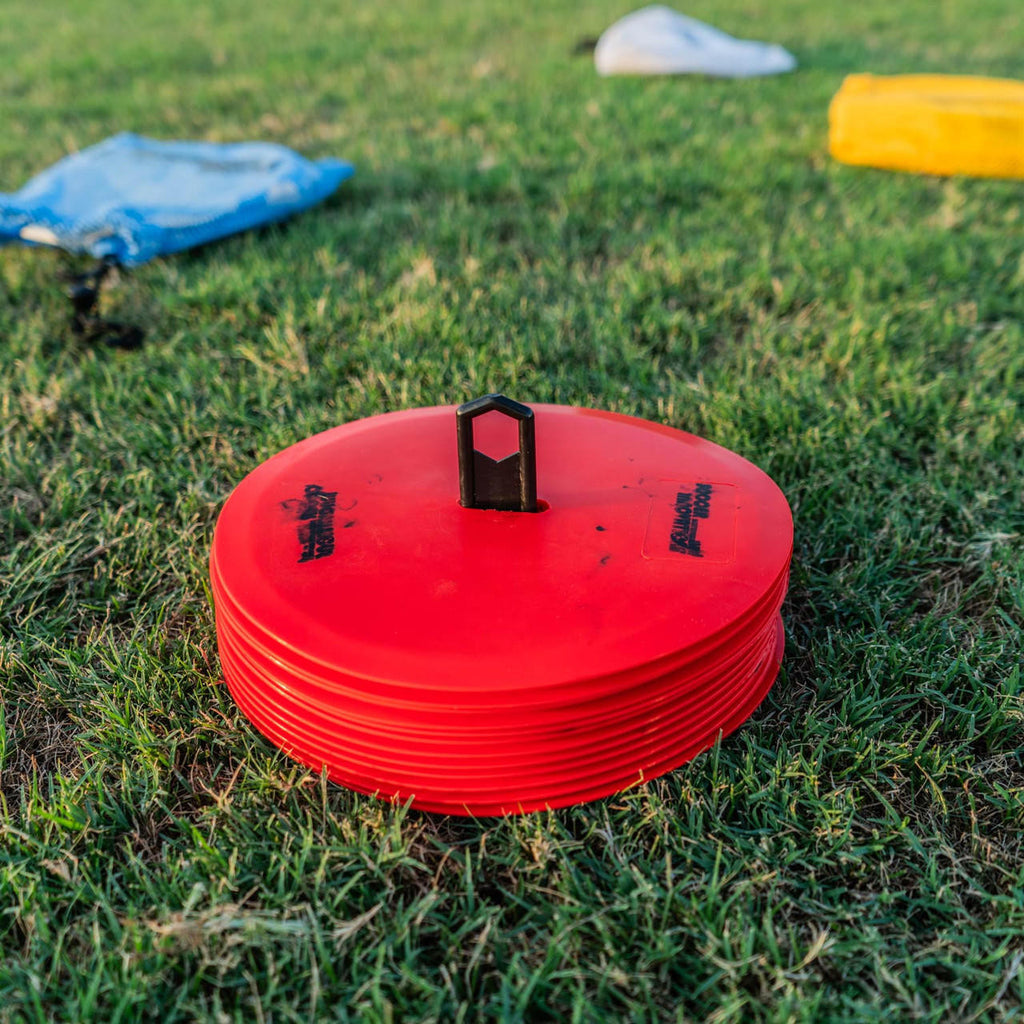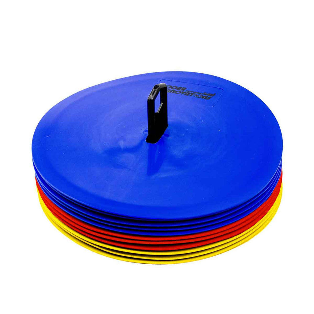 Este juego de discos de marcaje de Soccer Innovations es un complemento ideal para el equipo de cualquier entrenador. Aptos para cualquier superficie (interior, césped artificial, césped natural), representan la nueva generación en marcaje de cuadrícula. Gracias a su proximidad al suelo, los discos son difíciles de volcar. Los conos de disco tradicionales pueden interferir con el rodamiento del balón. Con estos marcadores planos, el balón rueda sin interrumpir su trayectoria ni mover el marcador.
