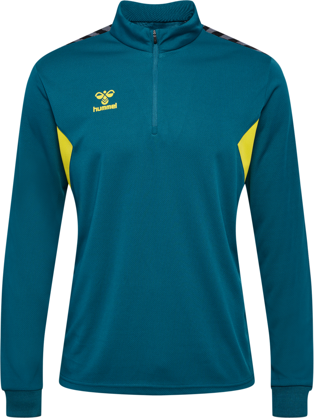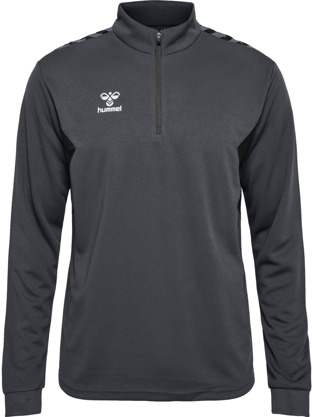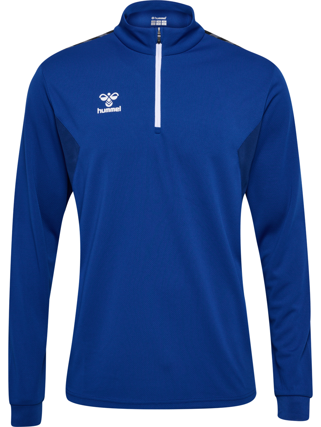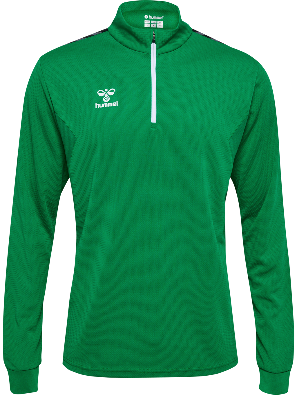 La sudadera hummel Authentic 24 con media cremallera está confeccionada con poliéster 100% reciclado para formar un tejido jacquard y luce la icónica cinta en forma de V de hummel en los hombros. Esta prenda de manga larga con media cremallera de hummel cuenta con una solapa protectora de dos piezas para evitar irritaciones y puños en las mangas para proteger del frío y mantener el calor.