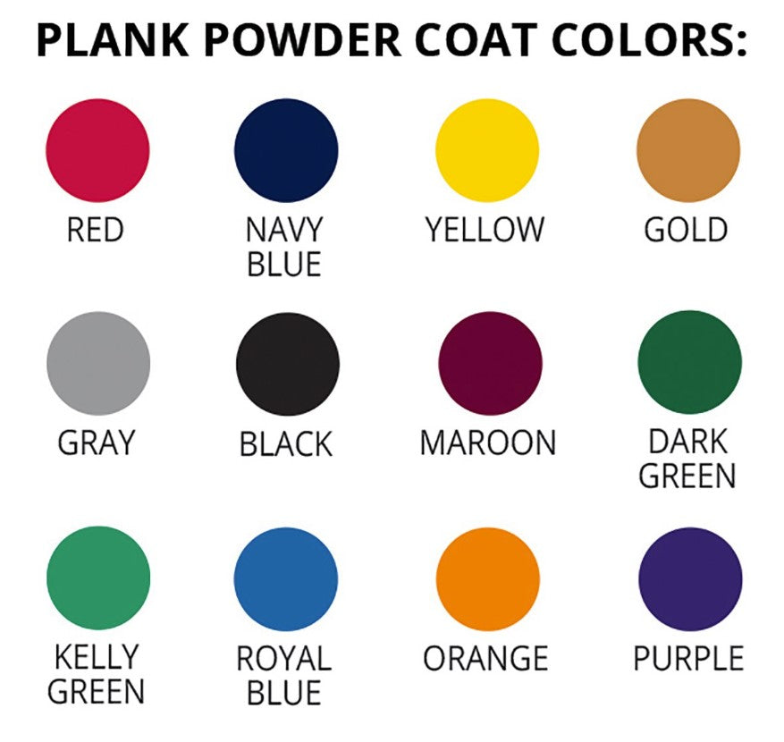 - Colores de tablones: Rojo | Azul marino | Amarillo | Dorado | Gris | Negro | Granate | Verde oscuro | Verde Kelly | Azul marino | Naranja | Morado