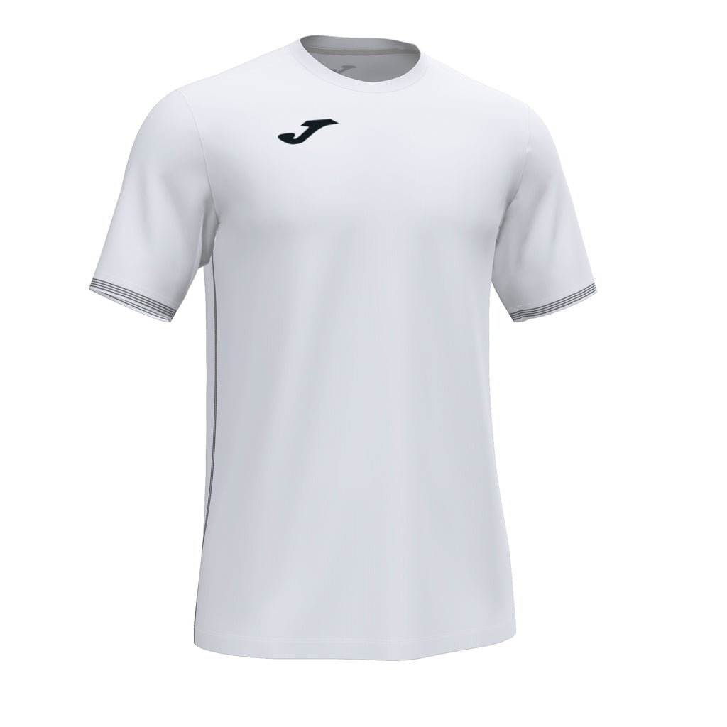 La camiseta de fútbol Joma Campus III presenta un diseño moderno con cuello redondo y puños acanalados, así como una banda lateral acanalada a rayas.