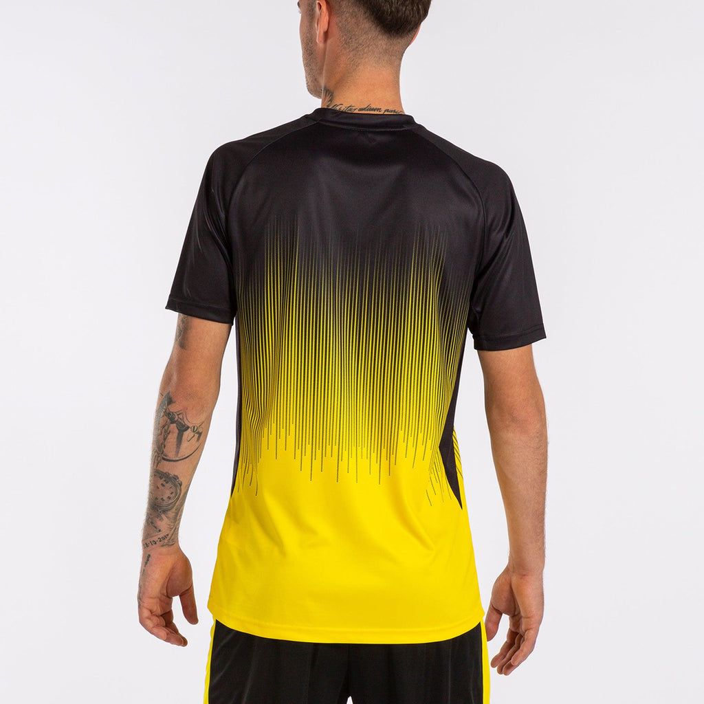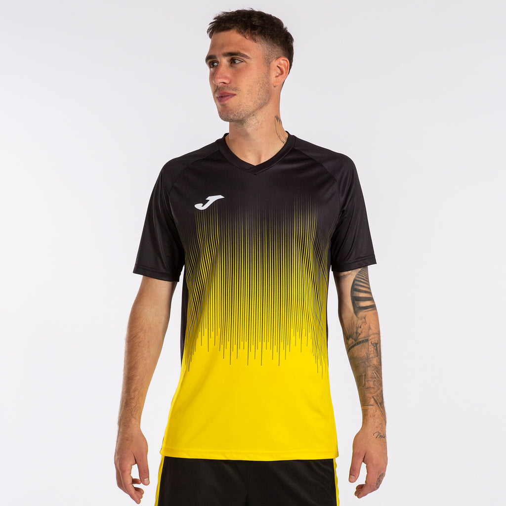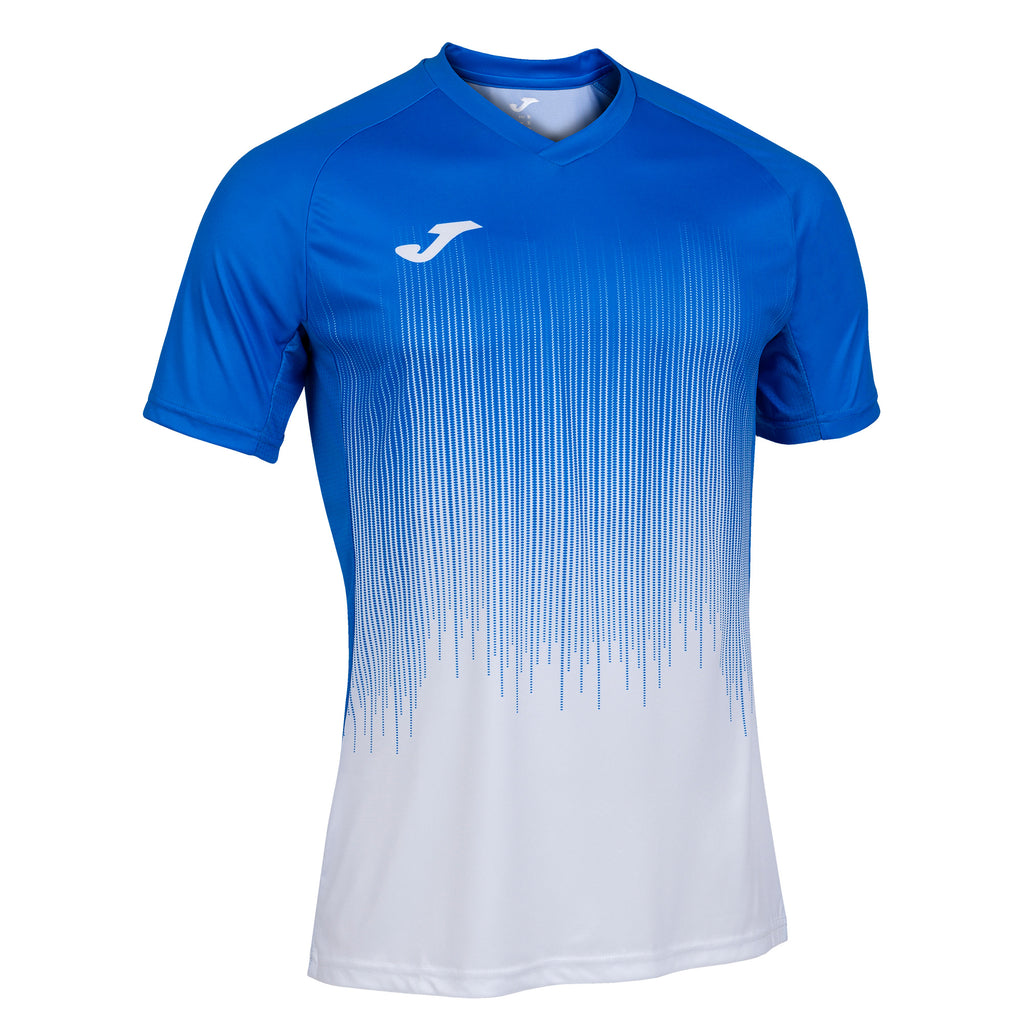 La camiseta de fútbol Joma Tiger IV presenta un cuello en V y una confección interlock de poliéster sublimada para un ajuste y una sensación cómodos.