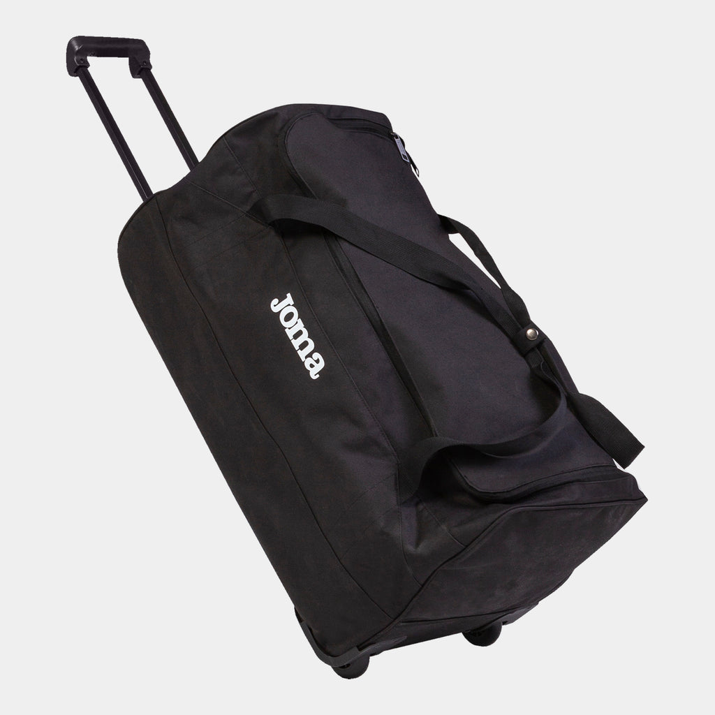La maleta de viaje Joma Travel Trolley es una bolsa grande, 100% poliéster, ideal para cualquier equipo o entrenador. Cuenta con ruedas y asa extensible para facilitar su transporte, incluso con cargas pesadas. Además, incluye una abertura lateral y un compartimento interior independiente para organizar la ropa.