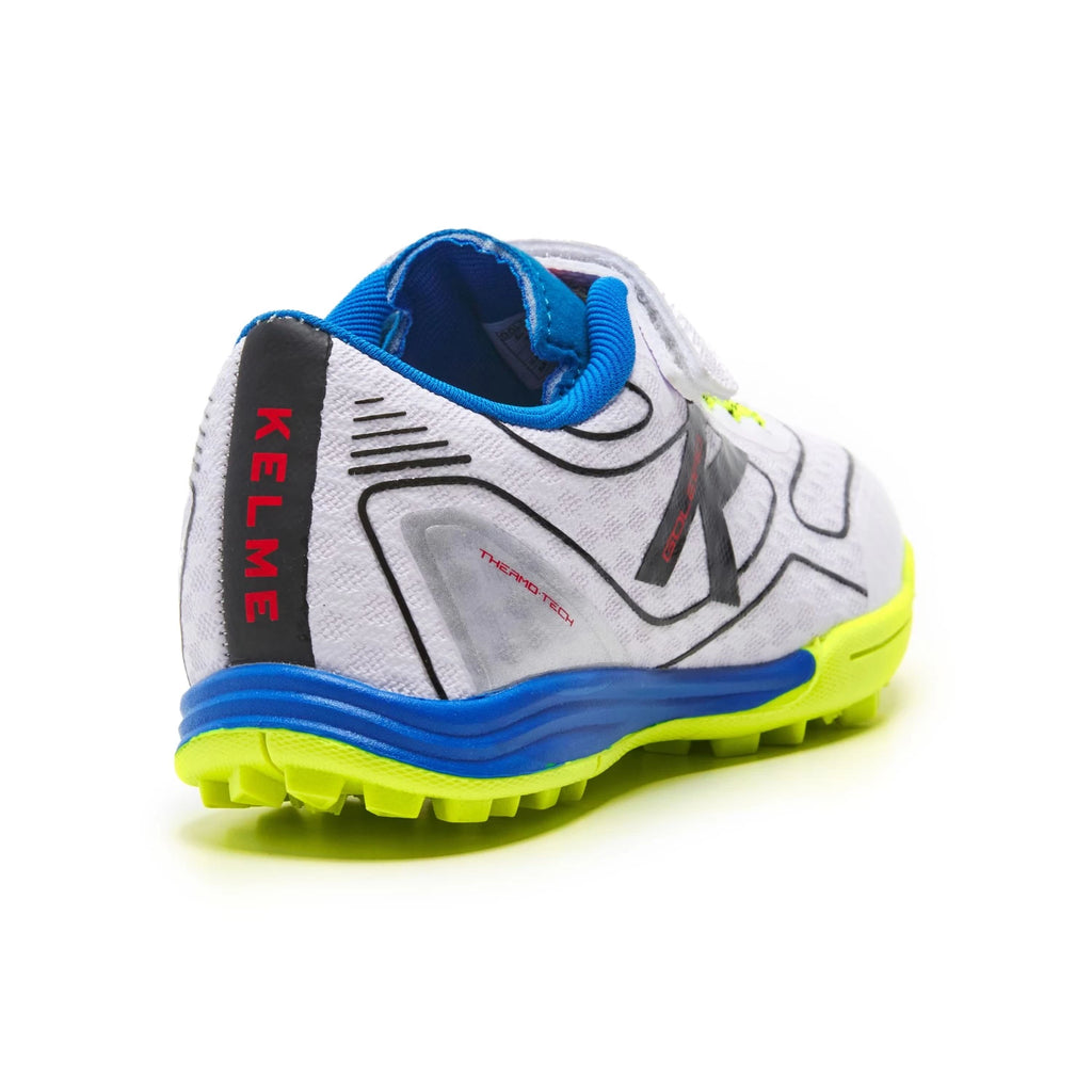 Las zapatillas Kelme Goliero Turf Elastic (blancas/azules) son un calzado juvenil, con el mismo diseño que su contraparte para adultos. Las Goliero cuentan con puntera reforzada con perforaciones, lo que garantiza una excelente transpirabilidad, cierre de correa y cordones que aseguran una sujeción firme del pie.