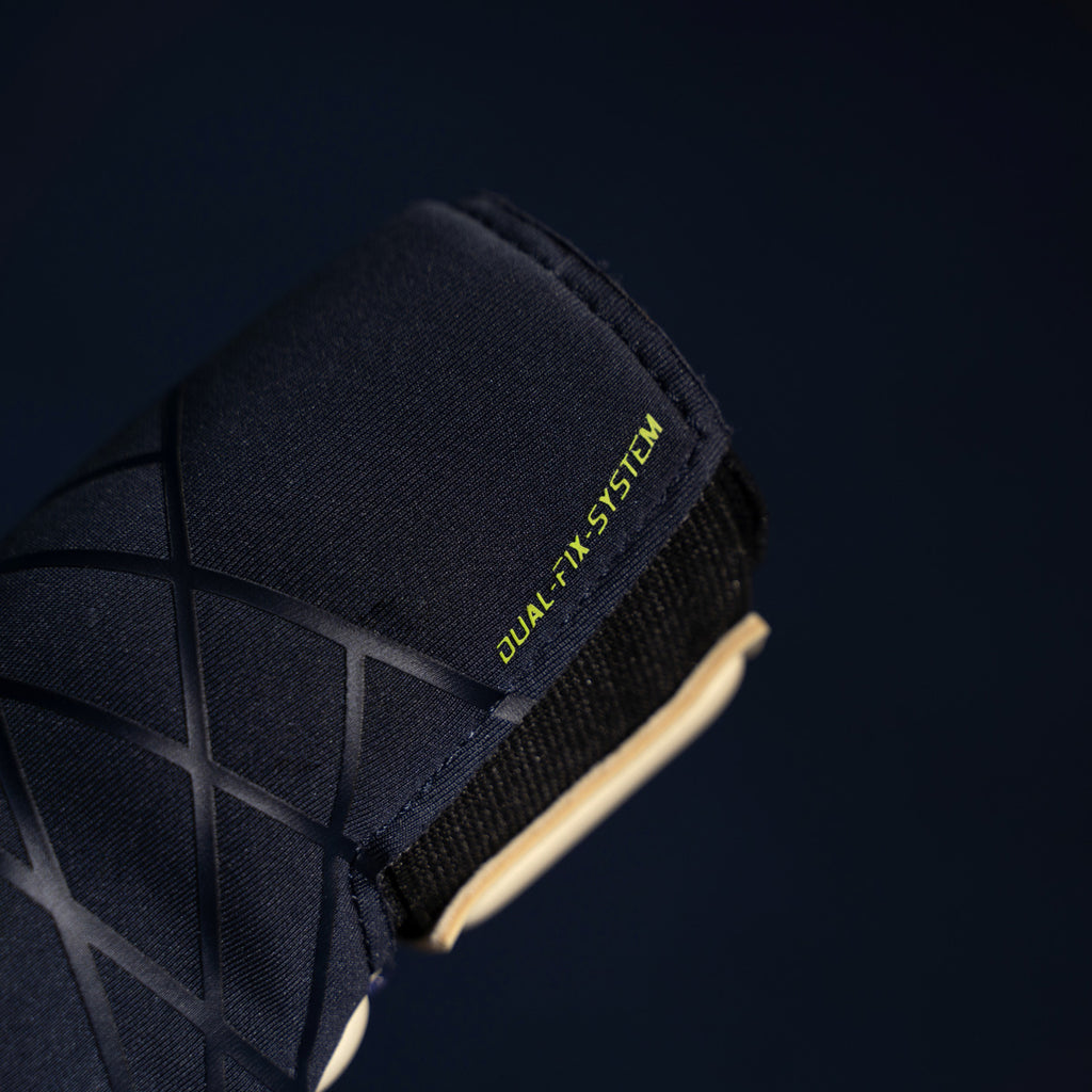 El innovador sistema de cierre Dual Fix System, con su estructura en forma de ala, asegura que los guantes queden perfectamente sujetos y proporciona al portero la máxima flexibilidad y estabilidad. Los extremos de las lengüetas de cierre, junto con una lengüeta adicional en el puño, facilitan la apertura y el cierre de los guantes, haciéndolos más fáciles de poner.