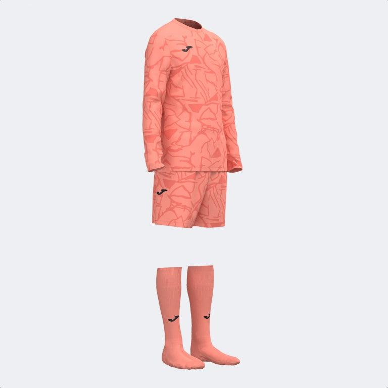 The Joma Zamora IX GK Set is the perfect choice for goalkeepers at all levels of competition. Constructed with high-performance, lightweight, and breathable fabric, this set includes a long-sleeved shirt with a round neckline and cover tape to enhance comfort and fit. The sublimated design adds a stylish touch. The elastic waistband and inner cord of the shorts offer a customizable fit for any body shape. Both pieces feature lightweight and durable fabric, as well as moisture-wicking technology to keep you cool. The socks are also designed with comfort and moisture management in mind, while maintaining elasticity for a secure fit.